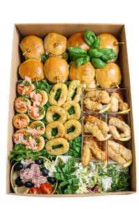 Lekki, elegancki i bardzo „na apetyt”. Zestaw składa się z łącznie pięciu rodzajów ryb i owoców morza: chrupiące bruschetty z kremowym tuńczykiem, mięciutkie bułeczki z łososiem, soczyste mini burgery rybne, jędrne krewetki oraz delikatne monoporcje klasycznej ryby po grecku. Wszystko świeżo przygotowane, pięknie ułożone i gotowe do podania — otwierasz, pachnie morzem i… znika w minutę.