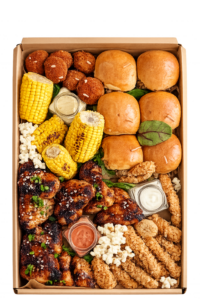 Zestaw 36 przekąsek w 5 smakach + 3 sosy. Chrupiąco-soczysta klasyka w stylu USA: nuggetsy, skrzydełka, mini burgery, serki panierowane oraz grillowana kukurydza. Estetycznie zapakowane, gotowe do podania — idealne na domówki i firmowe spotkania.